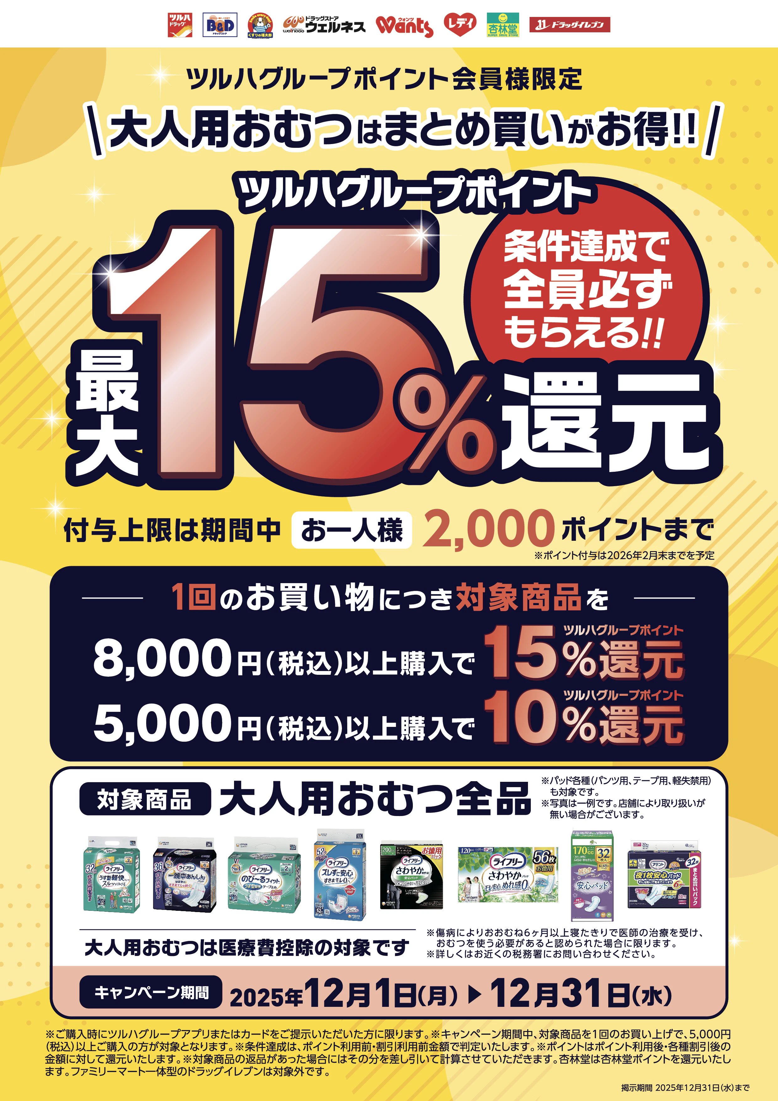 大人用おむつはまとめ買いがお得!!ツルハグループポイント最大15%還元キャンペーン
